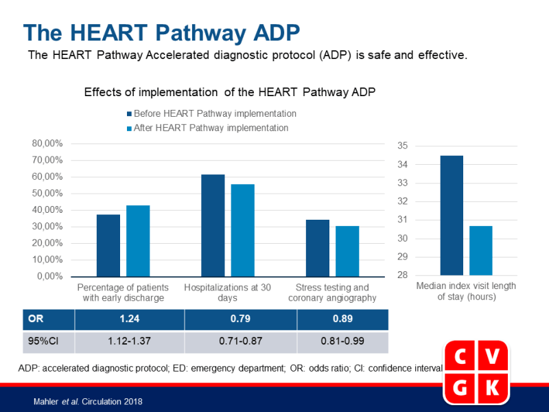 De HEART Pathway ADP is veilig en effectief in het verhogen van vroegtijdig SEH-ontslag en verlagen van ziekenhuisopnames, stresstesten en index-bezoekduur in patiënten met acute pijn op de borst. Deze resultaten kunnen impliceren dat stresstesten of cardiale beeldvorming niet langer aanbevolen moet worden voor de meeste laagrisicopatiënten en ondersteunen het gebruik van de HEART Pathway ADP voor risicostratificatie van patiënten met een vermoeden op ACS gedurende de acute fase.